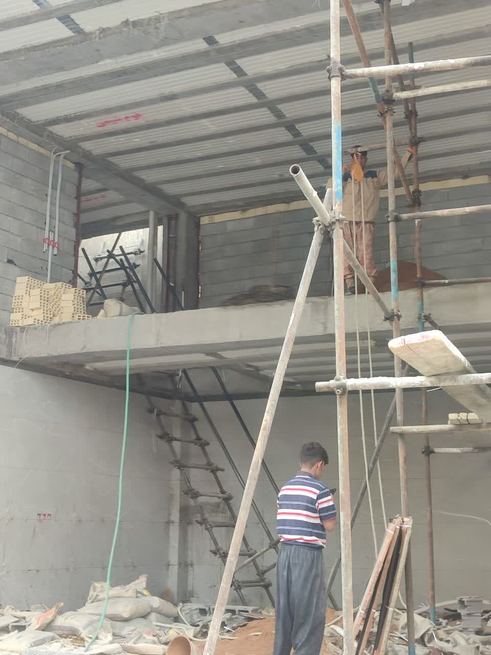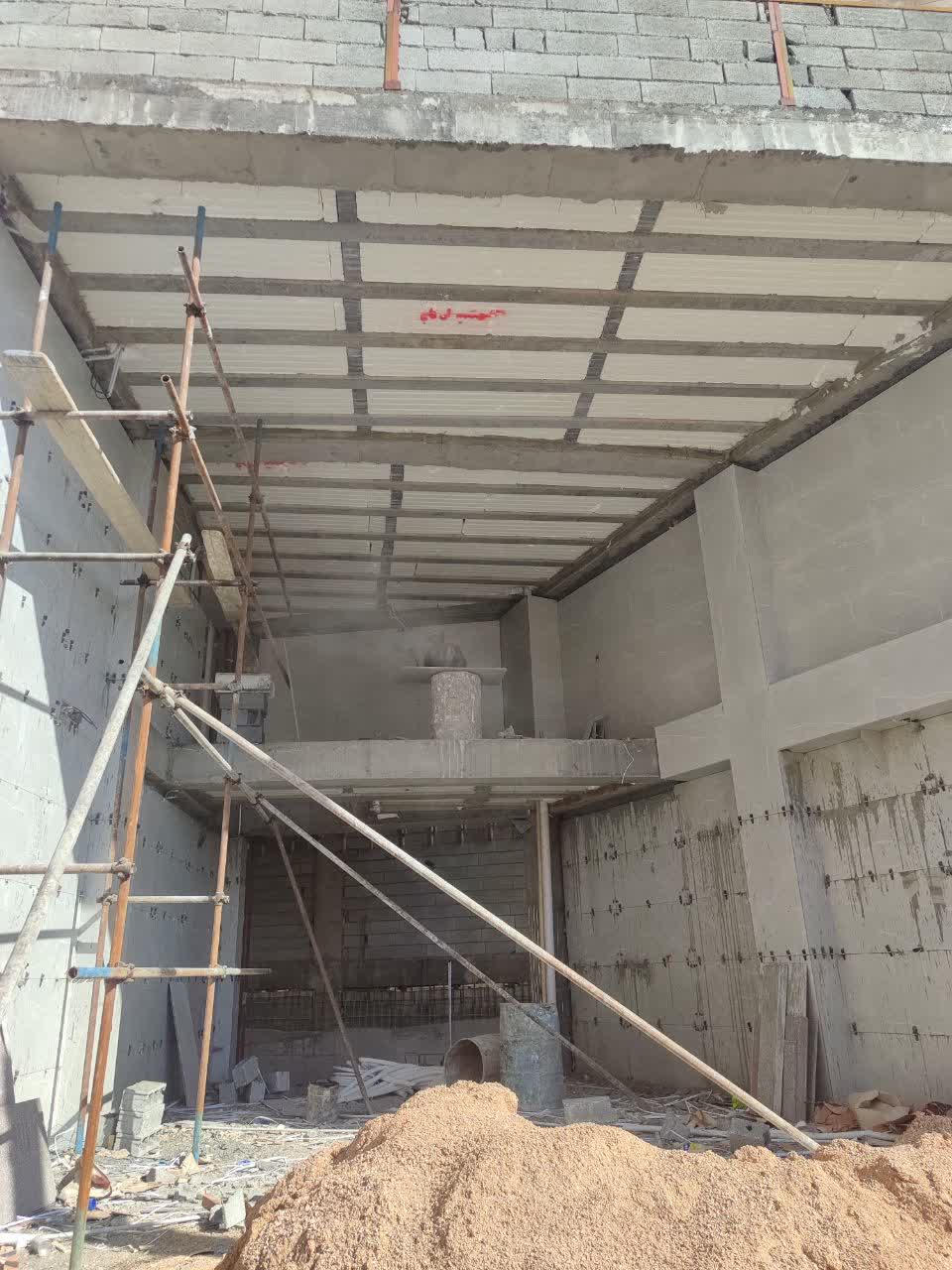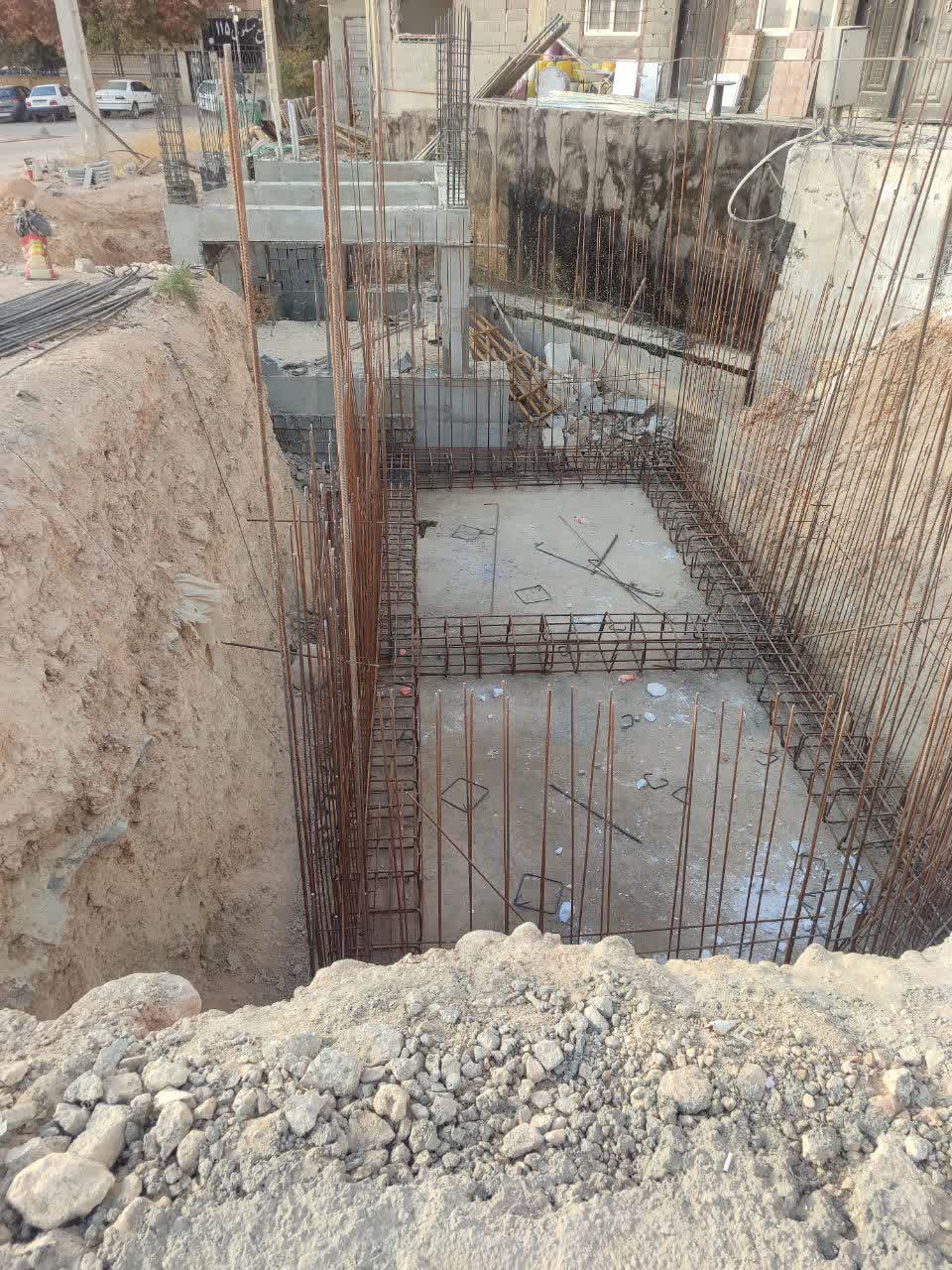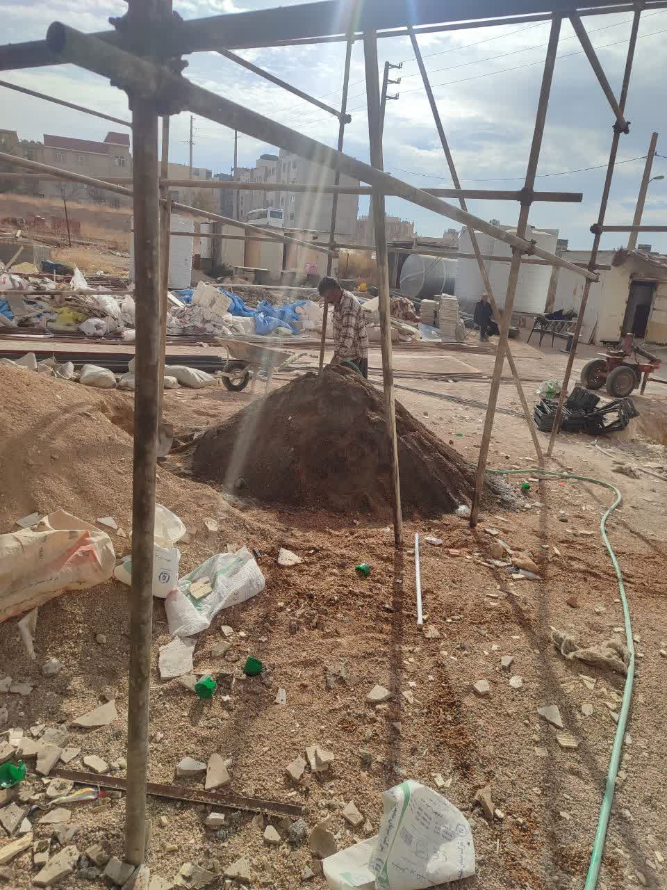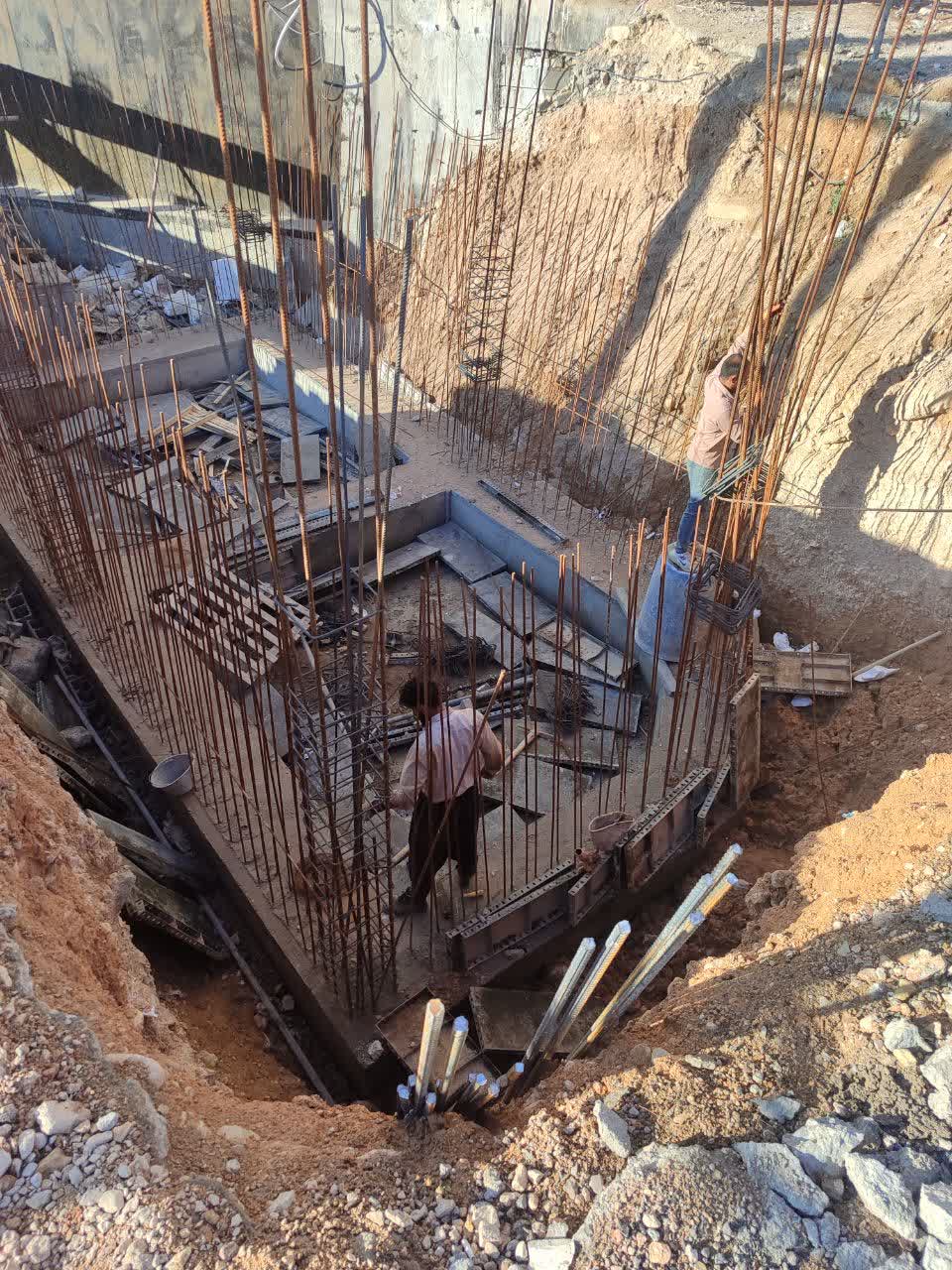 پروژه اندیشه 1404/10/01 : تمیزکاری نهایی بلوک دو / آرماتور بندی دیوار حائل تجاری / کناف بلوک دو / شیب بندی رمپ / انتقال درب اتاقی واحد مصالح