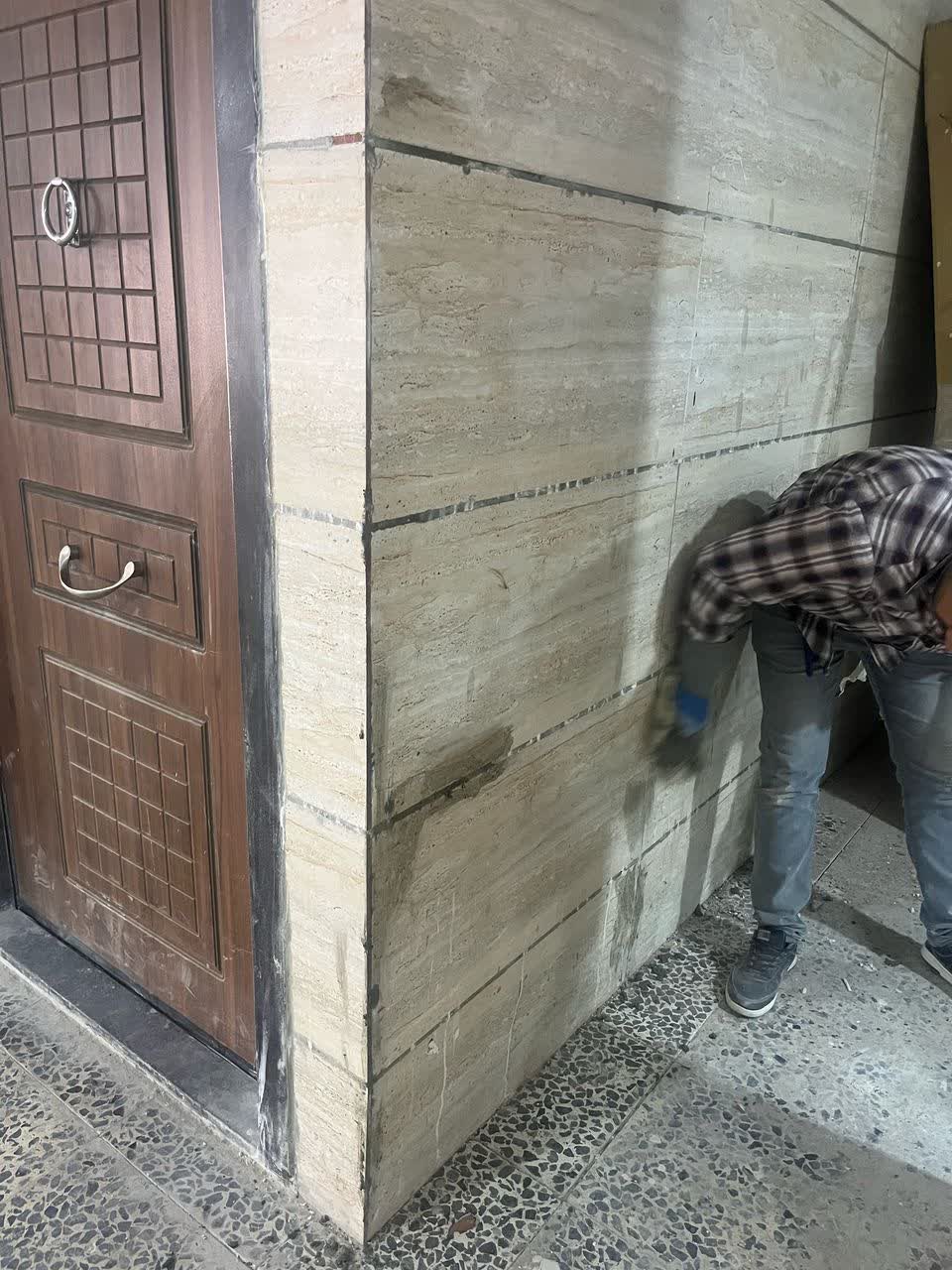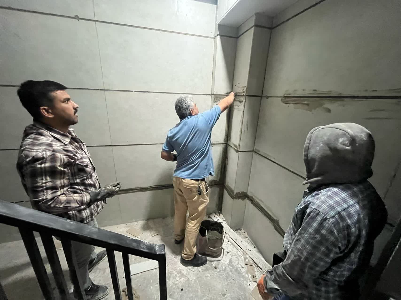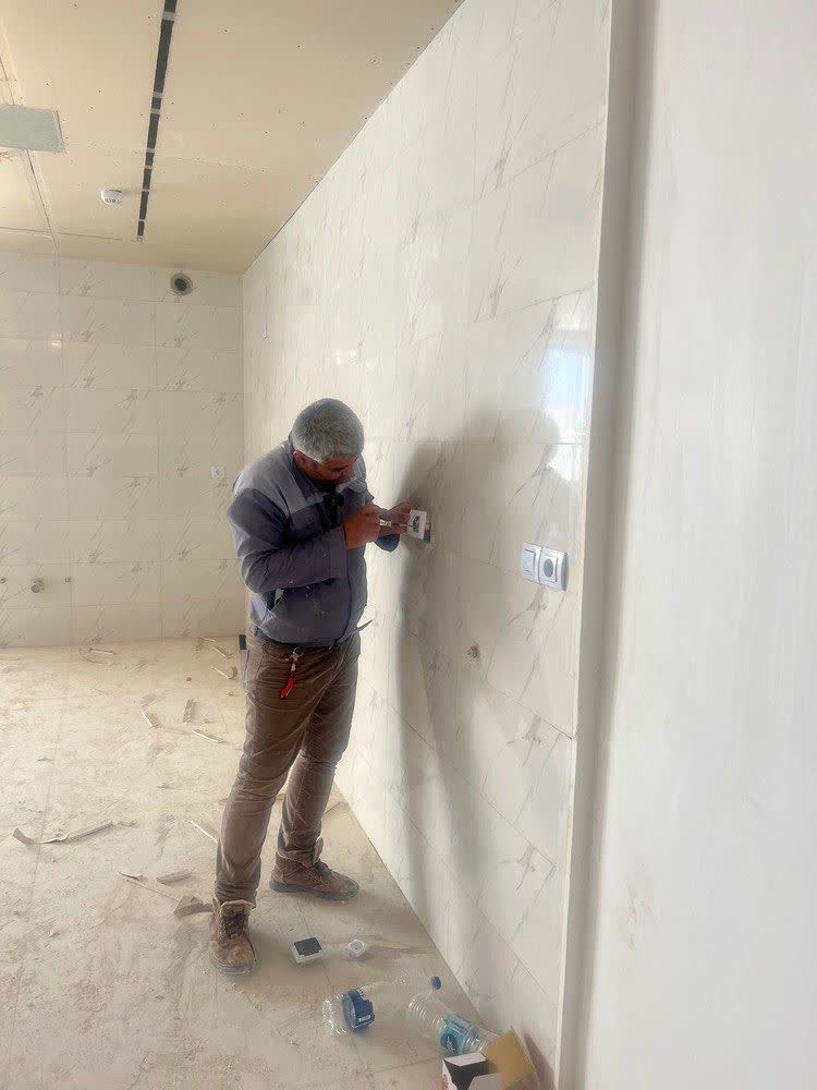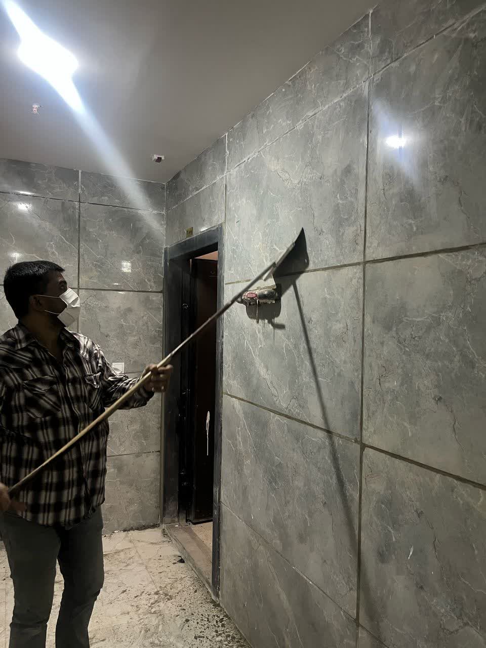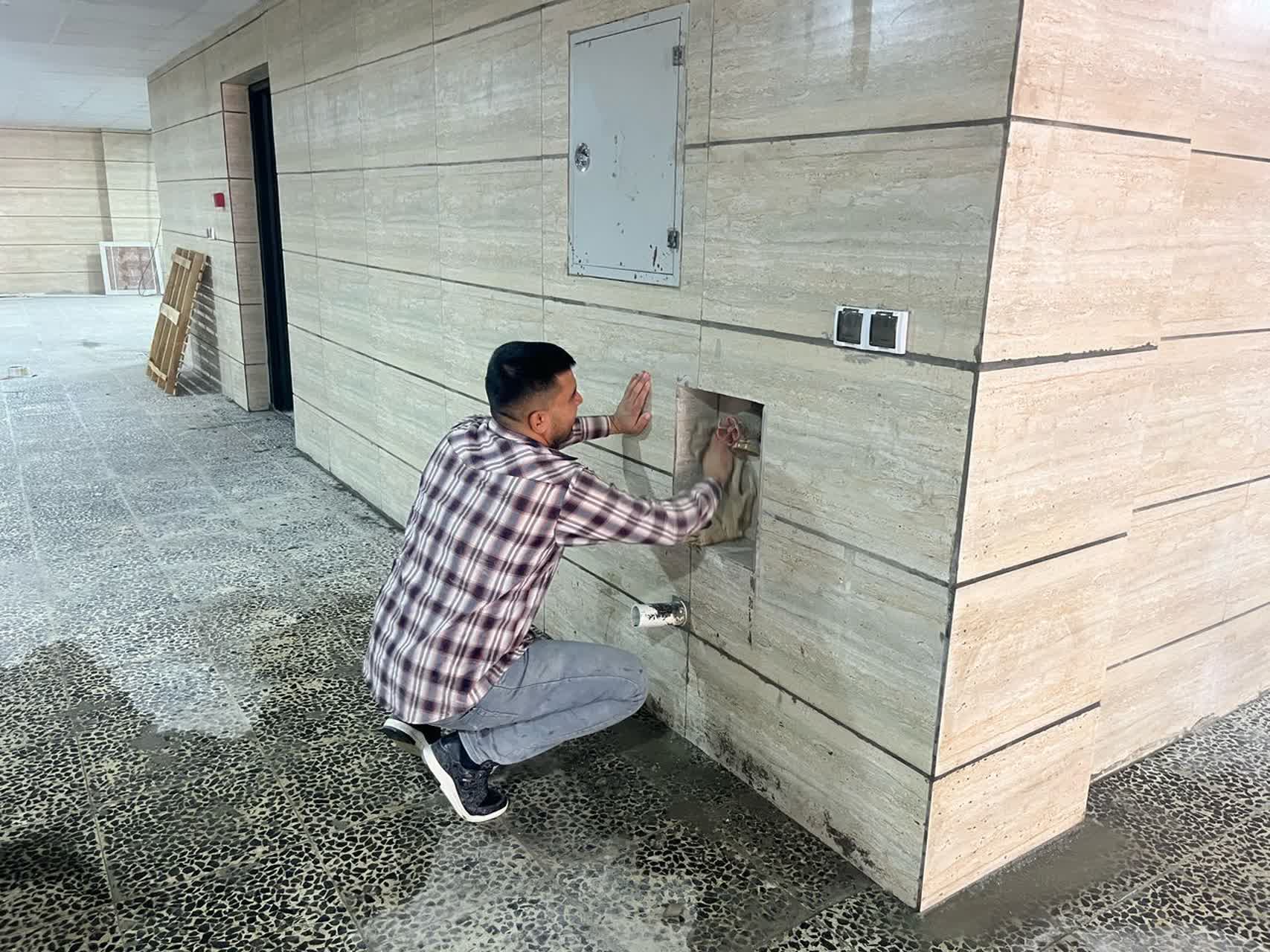 پروژه ارم 1403/12/05 : ادامه نمای لابی / نصب کلید و پریز / پرکردن چهارچوب درب لابی